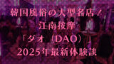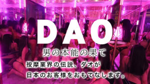 | DAO(ダオ) 日本語HP | 270,000₩/60分 (約28,000円)~ | 女の子(アガシ)の在籍数NO.1 在籍が多いため、昼の部でもクラブコースが思う存分に楽しめます。 |